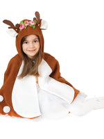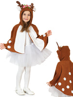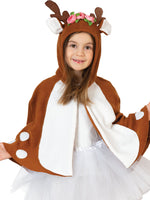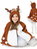 Pssst, da huscht es, das scheue Waldtier. Dort, ein Rehlein springt durchs Geäst, hab ihr es gesehen? Dieses süße Cape aus weichem Plüschmaterial ist das perfekte Outfit für jede Kinderparty, und überall dort, wo Märchen und Tierfiguren verzaubern. Das Cape hat eine Kapuze mit Ohren und ein Geweih, dieses ist mit Blumen verziert. Der Umhang ist braun und im Rückteil mit weißen Punkten versehen.