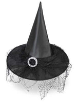 Dieser schwarze Spitz-Hhut mit Spinnenweben - Netztüll und großer Silberschnalle macht dein Outfit als Hexe erst komplett. Durch die große Schnalle wirkt er sehr edel und peppt dein Outfit auf. Er ist aus leichtem, glänzendem Material gefertigt und kann nach Wunsch noch verziert werden. Weitere Motto - Hüte in unserem Store: narrenwelt.com