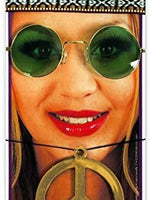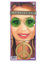 3 Teiliges Hippie-Set bestehend aus Stirnband, Brille und Kette. Hippie Flower Power Set 3teilig Brille (klein ) mit abgedunkelten Gläsern, keine Sonnenbrille + Kette mit schwarzer Schnur und goldfarbigem Peace Anhänger ca. 8,5 cm Durchmesser...