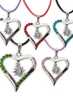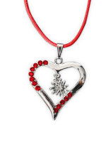 Schönes Accessoires für traditionelle, bayrische Bierfeste - als perfektes Highlight für Ihr Outfit , silberfarbener Edelweiß-Anhänger mit buntem Straßsteinchen an farblich passendem Band (Textilband)Kette Herz mit rotfarbenem Band, rotfarbenen Steinen und Edelweiß Farbe: silberfarben mit...