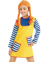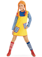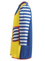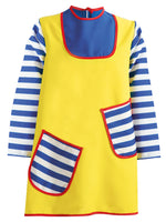 Nichts ist für freche Mädchen kleidsamer als ein farbenfrohes Kittelkleid! Dieses Exemplar wirkt besonders fröhlich durch das strahlende Gelb und die blau-weiß geringelten Ärmel. Die ebenfalls gestreiften, geräumigen Taschen sind, wie es sich für eine freche Göre gehört, schief und in unterschiedlicher Höhe angenäht. Ein perfektes Kostüm für echt starke Powermädchen