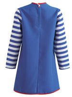 - Kleid Freche Göre, Grundfarbe gelb mit blau/weiß gestreiften Ärmeln und blau/weiß gestreiften, großen, ungleich aufgesetzten Taschen