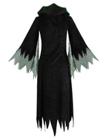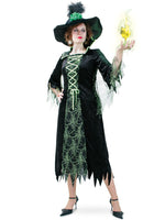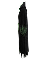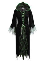 Elegantes Hexenkostüm in schwarz mit grünen Akzenten in Form von Verschnürungen, gedruckten Spinnweben und Kragenbesatz.