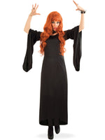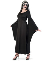 einteiliges Kleid Mortina bodenlang mit langen, weiten Trompetenärmeln vielseitig, mit abgewandeltem jeweiligen Zubehör tragbar zum Beispiel als Kostüm: , Vampir, Hexe, Punker, Gothic, Vamp Farbe: schwarz Material: fließendes Material, 100% PES Lieferumfang: Kleid Mortina ohne...