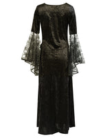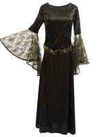 - elegantes, bodenlanges, Kleid in schwarz mit Trompetenärmel und Goldgürtel
