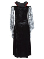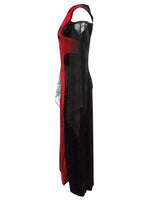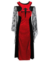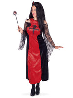 Erobere die Vampirherzen! Als kühne Dämonin in einem Kostüm in den Farben rot/schwarz fällt das bestimmt nicht schwer! Das rassige Kleid ist lang geschnitten mit einem großen Kreuz-Print auf der Vorderseite. Die Ärmel sind aus Tüll und unterstreichen das aparte Kleid. Das Dämonia-Kleid ist auf der Rückseite uni schwarz, aus weichem Pannesamt und schulterfrei
