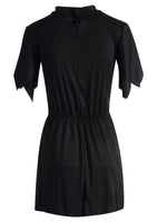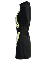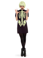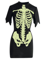 Dieses kurzärmelige Mini - Skelettkleid ist der Hingucker auf jeder Party schlechthin. Ganz in uni schwarz gehalten, besticht es durch den nachtleuchtenden Skelettaufdruck. Ein bequemes, schnelles Outfit für die nächste Halloween Mottoparty