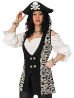 Die Skull-Weste mit Totenkopf vereint Piraten- und Halloween-Elemente in einem ausgefallenen Gehrock-Style. Die Kombination aus weiß und schwarz, sowie das gruselige Skull-Design machen dieses Polyester-Kostüm zu einem echten Hingucker. Perfekt für Damen, die auf der Suche nach einem ausgefallenen und thematisch passenden Outfit für besondere Anlässe sind.