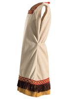 - Farbe: beige mit Bordürenbesatz am Halsauschnitt und am Saum plus zusätzlich Fransen