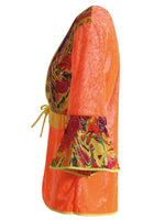 Oberteil mit langem Arm, Arm vorn weit ausgestellt und mit anderer Stoffart angesetzt, Fransen in der Mitte vorn , Bindeschnur vorne, teilweise Pannesamtoptik und bunter Stoff, rundherum mit farblich abgesetzter Paspel Größe 42, Material:100% PESLieferumfang:...