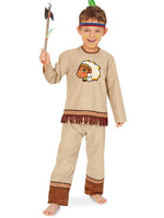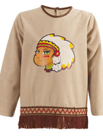 Für kleine Indianer ist dieses zweiteilige Kostüm genau das Richtige! Der bequeme Schnitt lässt viel Bewegungsfreiheit, und die harmonische Gestaltung mit Fransen und Zackenborte sieht richtig schön indianisch aus. Als besonderes Highlight hat das Oberteil einen lustigen Comicaufdruck.