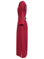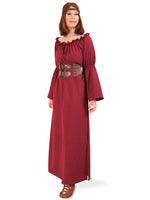Tauchen Sie ein in die sagenumwobene Welt der Nibelungen . Fühlen Sie sich wie Kriemhild in dieser historischen, schlichten, königlichen Robe. Das Kleid besticht durch seinen schnörkellosen Schnitt mit dem Carmenausschnitt und seinen geraden Fall. In der Mitte wird das Kleid durch einen breiten miederartigen Gürtel gerafft.