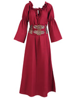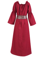 Tauchen Sie ein in die sagenumwobene Welt der Nibelungen . Fühlen Sie sich wie Kriemhild in dieser historischen, schlichten, königlichen Robe. Das Kleid besticht durch seinen schnörkellosen Schnitt mit dem Carmenausschnitt und seinen geraden Fall. In der Mitte wird das Kleid durch einen breiten miederartigen Gürtel gerafft.