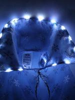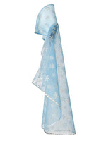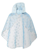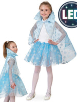 Dieses süße Cape, passend zum Röckchen Schneeflocke, ist das perfekte Outfit für jede Kinderparty, und überall dort, wo die Schneefee verzaubert. Das Cape ist aus hauchzartem, hellblauem Tüll gefertigt,.Der Stoff ist über und über mit silbernen Glitzer-Schneekristallen übersät. Der große Kragen ist mit LED - Lämpchen verziert, so setzt sich die Schneefee bei Finsternis gekonnt in Szene.