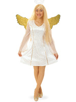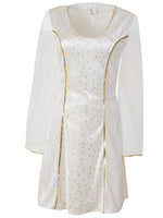Wie gerade aus den Sphären den Himmels zu uns herabgestiegen, so wirkt dieser Engel. Das kurze Kleid ist aus schimmerndem Pannesamt und luftigem Tüll gefertigt, mit golden glänzenden Sternchen und Pailletten. Damit gelingt auch nicht ganz so frommen Damen ein überzeugend himmlischer Auftritt!