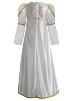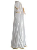 - Engelchenkleid aus glänzendem weißen Satin mit Puffärmelchen, Tüllelementen und glänzenden Goldborten