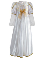 Engelchenkleid aus glänzendem weißen Satin mit Puffärmelchen, Tüllelementen und glänzenden Goldborten Material: 100 % Polyester Design: Weihnachtsengel- weiß/gold Lieferumfang: 1 Kleid Größe 104, ohne sonstiges Zubehör (Abbildung Design-Beispiel) das Kleid ist in den Größen 104-164...