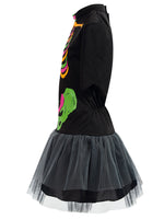 Dieses kurze Kleid sorgt an Halloween für einen coolen gruseligen Look! Der aufwendigem angesetzter Tüllrock gibt dem Gerippchen - Kleid ein schwungvolles Flair. Das Mini-Kleid besticht durch das bunte Gerippe auf der tiefschwarzen Farbe. Der Skelettdruck ist zudem bunt nachtleuchtend und wird dich in schaurig dunklen Gruselnächten sehr eindrucksvoll in Szene setzen. Der große, leuchtend bunte Skelettaufdruck scheint sich im Dunkeln allein zu bewegen und so können Knochenmädchen sich auf jeder Gruselparty sehen lassen!