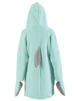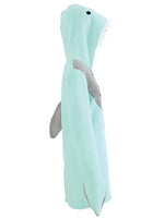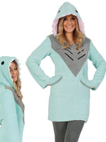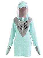 Kuscheliges Hai - Kleid aus Polarfleece in eisblau. Akzente setzen die rosa gefütterte Kapuze mit Zähnen und Augen, eine angebrachte Flosse im Rückenteil, und die Handwärmer. Ideal einsetzbar zum Straßenkarneval und auf Mottopartys