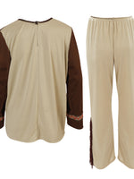 🐎 Design und Stil: Das Kostüm „Anando“ besteht aus einem Oberteil und einer passenden Hose, beide in einem sanften Beigeton gehalten, der die Weiten der Prärie widerspiegelt. Die aufwendigen Applikationen und Fransen in einem warmen Braunton sorgen für eine markante Optik und verleihen dem Kostüm seinen unverwechselbaren Western-Charme. 🐎 Material: Gefertigt aus 100% Polyester bietet das Kostüm „Anando“ eine angenehme und bequeme Passform, die den ganzen Abend über optimalen Tragekomfort bietet. 🐎