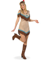 • 1tlg. kurzes Damen-Kleid Indianerin beige/braun mit Fransen an Oberteil und Rock und blauer Borte