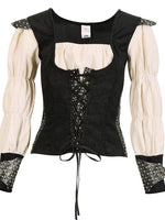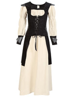 Tauchen Sie ein in die sagenumwobene Welt der Nibelungen. Fühlen Sie sich wie Kriemhild und Co. in dieser historischen, schlichten, königlichen Robe. Das 2 tlg. Kleid besticht durch seinen schnörkellosen Schnitt mit dem schönen Dekolleté - Ausschnitt und seinem geraden Fall. Zur beigen Grundfarbe erzielt besonders das Oberteil mit einem schwarzen, geschnürten Mieder, abgesetzten Schulterarmklappen und Armabschlüssen in Nietendesign, große Wirkung. Das Oberteil wird im Rücken durch einen Reißverschluß geschlossen Das Mieder setzt sich seitlich über den Rock, der mit Gummizug versehen ist, in der Verlängerung fort.