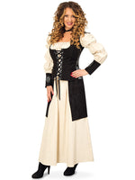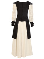 Tauchen Sie ein in die sagenumwobene Welt der Nibelungen. Fühlen Sie sich wie Kriemhild und Co. in dieser historischen, schlichten, königlichen Robe. Das 2 tlg. Kleid besticht durch seinen schnörkellosen Schnitt mit dem schönen Dekolleté - Ausschnitt und seinem geraden Fall. Zur beigen Grundfarbe erzielt besonders das Oberteil mit einem schwarzen, geschnürten Mieder, abgesetzten Schulterarmklappen und Armabschlüssen in Nietendesign, große Wirkung. Das Oberteil wird im Rücken durch einen Reißverschluß geschlossen Das Mieder setzt sich seitlich über den Rock, der mit Gummizug versehen ist, in der Verlängerung fort.