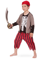 Da fürchtet sich sogar der Klabautermann! Gestaltet mit Halloween Elementen , ist das Piratenkostüm für Kinder eine fantasievolle Verkleidung für kleine Freibeuter mit Bewegungsdrang! Das Kostüm besteht aus Oberteil mit Skelettprint, einer klassisch gestreiften Hose und eine Kopftuch.