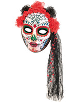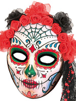 Lieferumfang: 1 Halbmaske Horror mexikanischer Totentag ( Dia de los Muertos) mit Kunstrosen und seitlichem Tüll