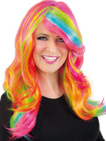 Freche bunte Langhaar Perücke mit Pony. Knalliges Rosa kombiniert mit Gelb und Hellblau so herrlich bunt wie Bonbons