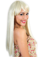• Perücke mit langen, blonden, glatten Haaren und einem geraden Pony