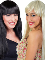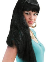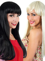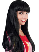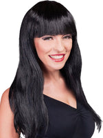 • Perücke mit langen, schwarzen, glatten Haaren und einem geraden Pony
