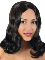 Eine Perücke für viele Gelegenheiten. Schulterlang, schwarz und mit Mittelscheitel ist sie eine ganz klassische Perücke.