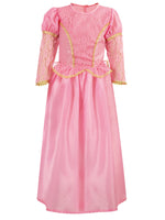 Ein Mädchentraum in Pink ist dieses knöchellange Kleid aus edel glänzendem Satin. Für Ärmel und Oberteil wurde ein besonders schöner Tüll mit verspieltem Blumenmuster verwendet. Die glitzernden Goldborten dürfen bei einer echten Prinzessin natürlich auch nicht fehlen. So kann es losgehen zum Märchenball!