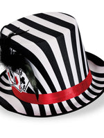 - Zylinder Pierrot schwarz/weiß gestreift, mit rotem Satinband, Motiv Spielkarten und schwarzen Federn