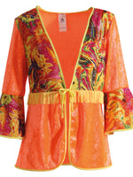 Oberteil mit langem Arm, Arm vorn weit ausgestellt und mit anderer Stoffart angesetzt, Fransen in der Mitte vorn , Bindeschnur vorne, teilweise Pannesamtoptik und bunter Stoff, rundherum mit farblich abgesetzter Paspel Größe 46, Material:100% PESLieferumfang:...