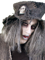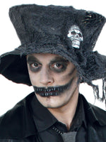 Mit diesem grauen, düsteren Halloween Zombiehut wirken Sie wie der Zombie-Meister höchstpersönlich. Der graue Fetzenstoff ist am Hutrand ausgefranst und es ziert den ganzen Hut vorne ein gruseliger, heller Totenkopf. Ein absolutes Muss für die nächste Halloween-Mottoparty.