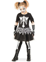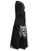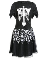 Print -weiße Knochen - auf schwarzem Grund auf dem Oberteil, mehrlagiger Rock im Materialmix, mit glitzerndem, schwarzen Tüll und kurzem Überrock mit auffälligem Totenkopfdruck, zugehörige Leggings in schwarz Material: 100% Polyester Lieferumfang: 1 Skeleton Kleid...